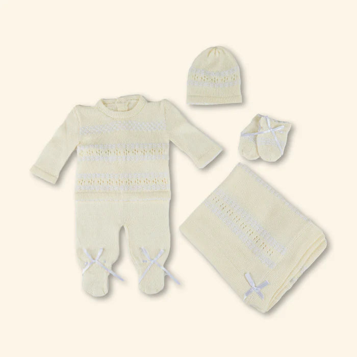 Your little piece of heaven will be warm and nice in this long sleeve yellow knitwear, 100% cotton top-bottom set with cap, mittens and blanket.