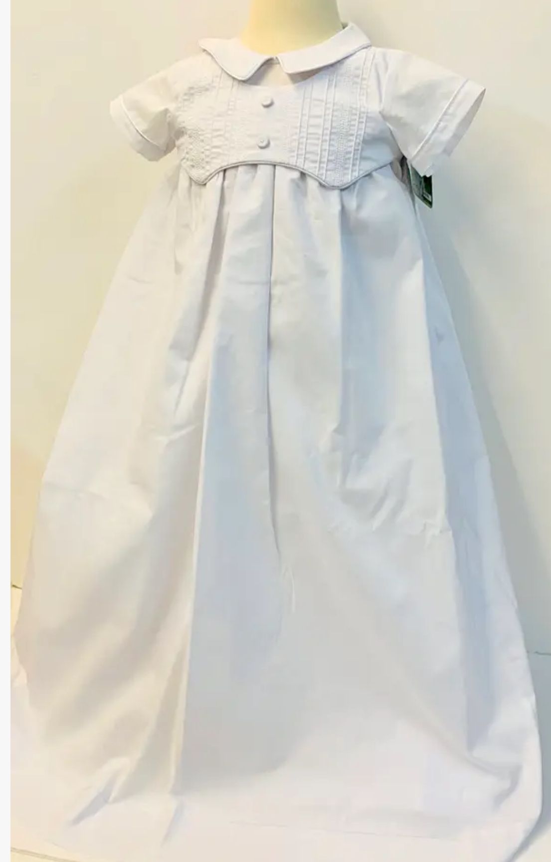 3pc boys christening gown with elegant vest detail. Unbuttons to reveal a matching romper