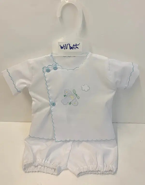White blue baby boy wrap set with shadow embroidered blue airplane, with elegant blue border trim. Blue buttons and elastic trim on legs. Sizes Preemie and Newborn.
