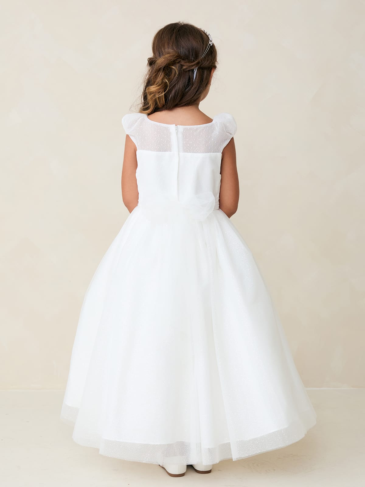 Formal kids dresses – This enchanting girls’ dress is a vision of elegance, perfect for special occasions. Featuring adorable cap sleeves and glitter throughout and beautiful lace applique at the bodice. Fully lined, Zipper back and tie back. This dress is ideal for flower girls, first communions, or any formal event where your little one deserves to shine.