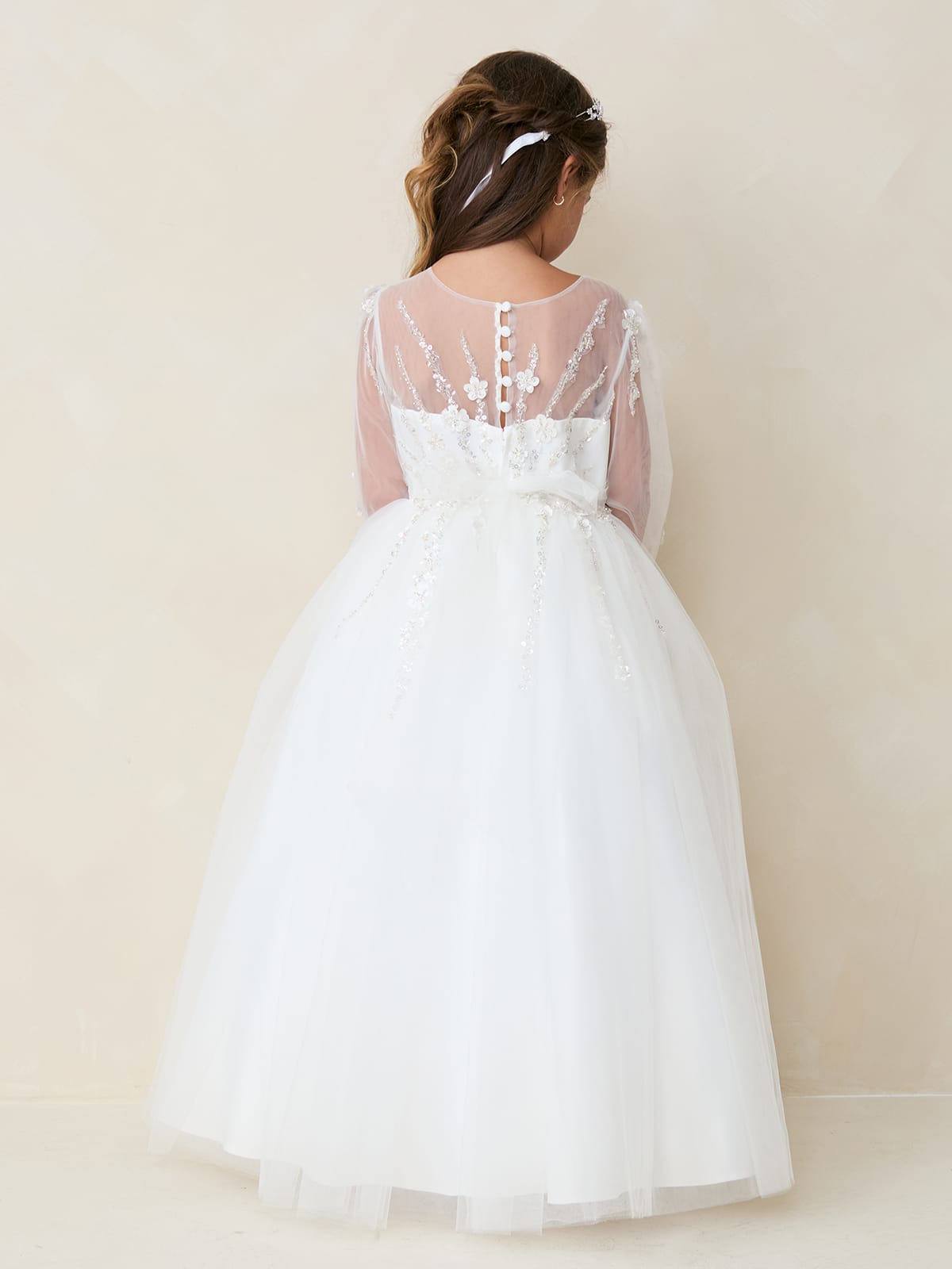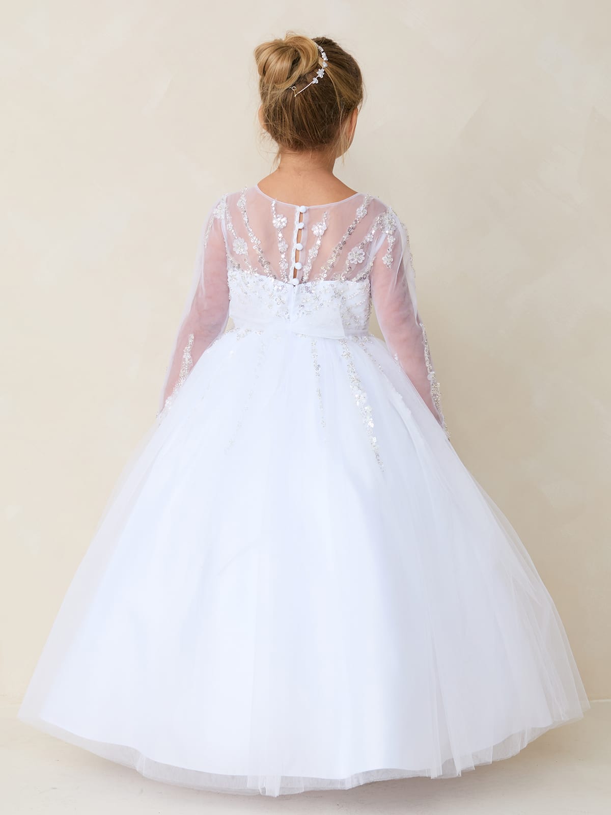 Formal kids dresses – Make every special occasion magical with this breathtaking girls’ long-sleeve dress. Designed with an illusion mesh neckline and sleeves, this dress features intricate floral embroidery and shimmering beadwork that add a touch of elegance. The fitted bodice gracefully transitions into a voluminous tulle skirt, creating a regal, princess-like silhouette. Perfect for flower girls, first communions, or any formal event, this gown ensures your little one looks and feels like royalty.
