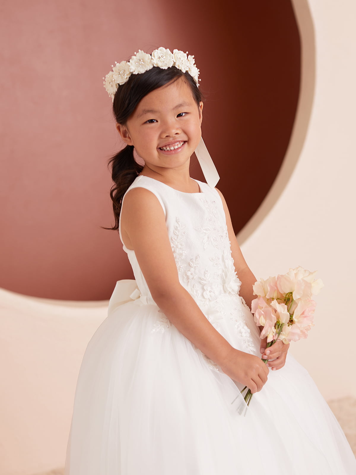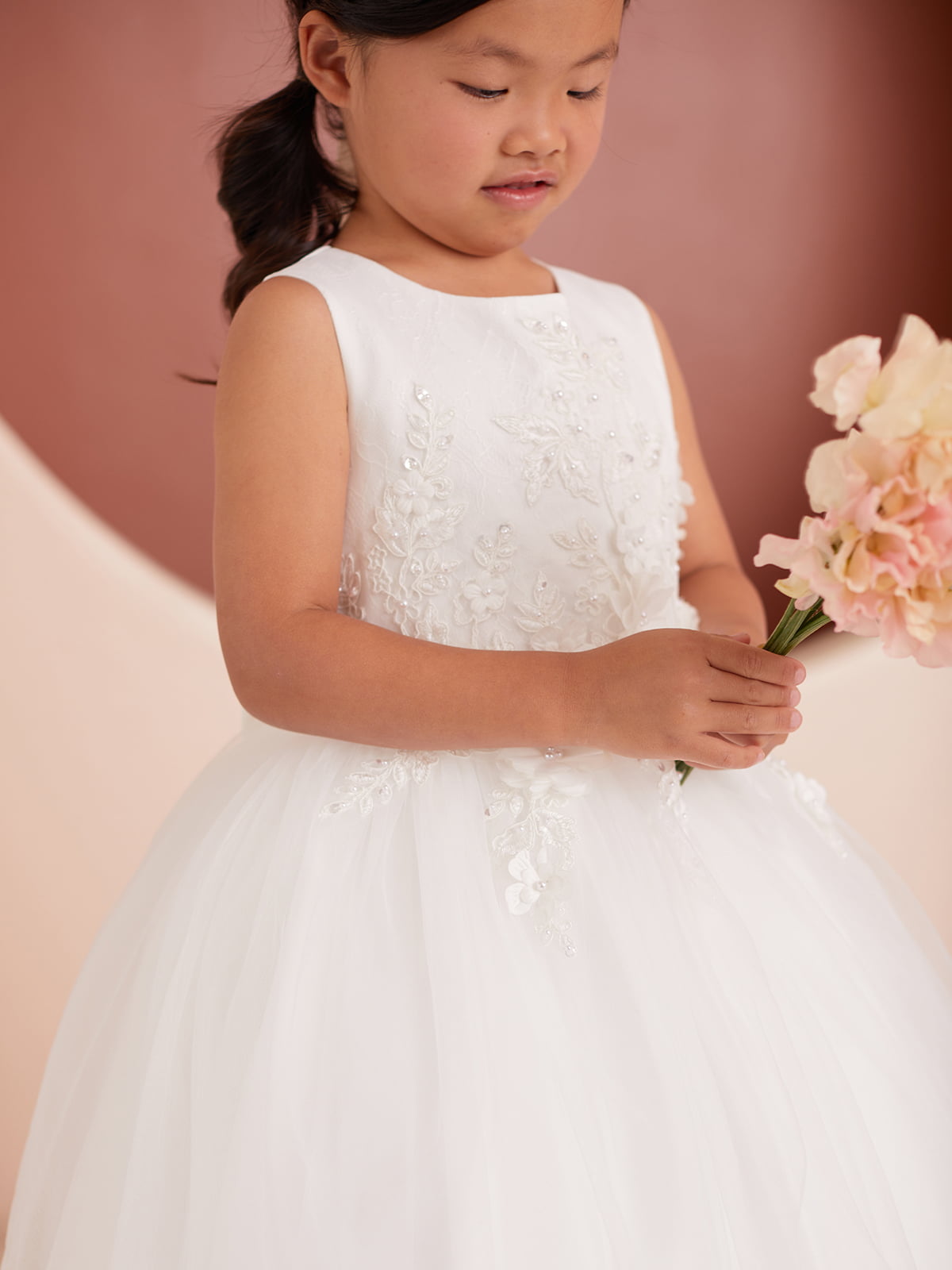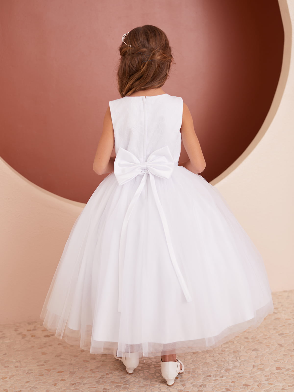 Formal kids dresses – This dress features a sleeveless illusion neckline bodice with 3D floral lace details. The skirt is made of lace and features a frontal floral design. Zipper back and sash tie back. Length – Tea Length (NOTE dress may fall at different lengths based upon each child’s body proportions).