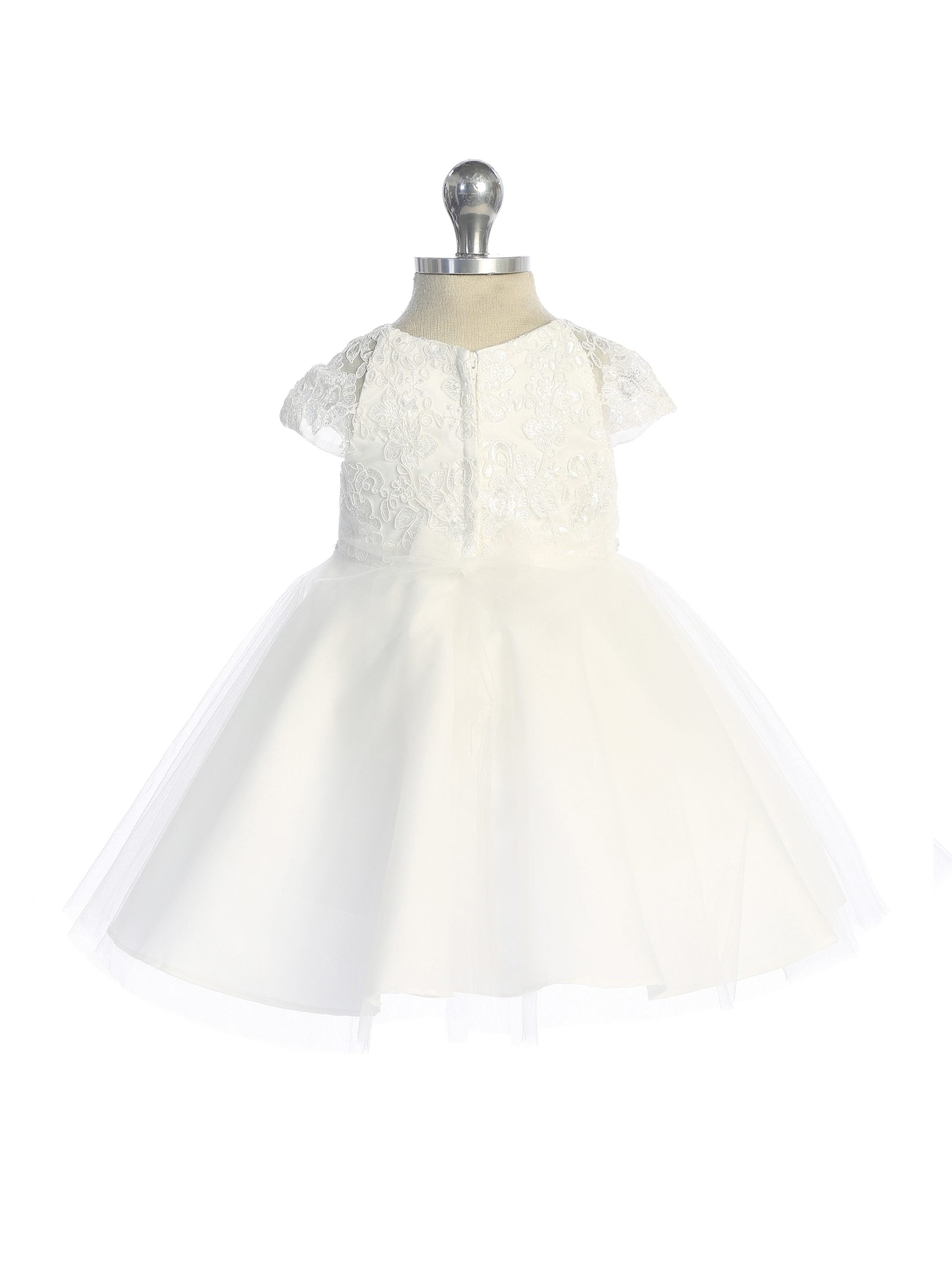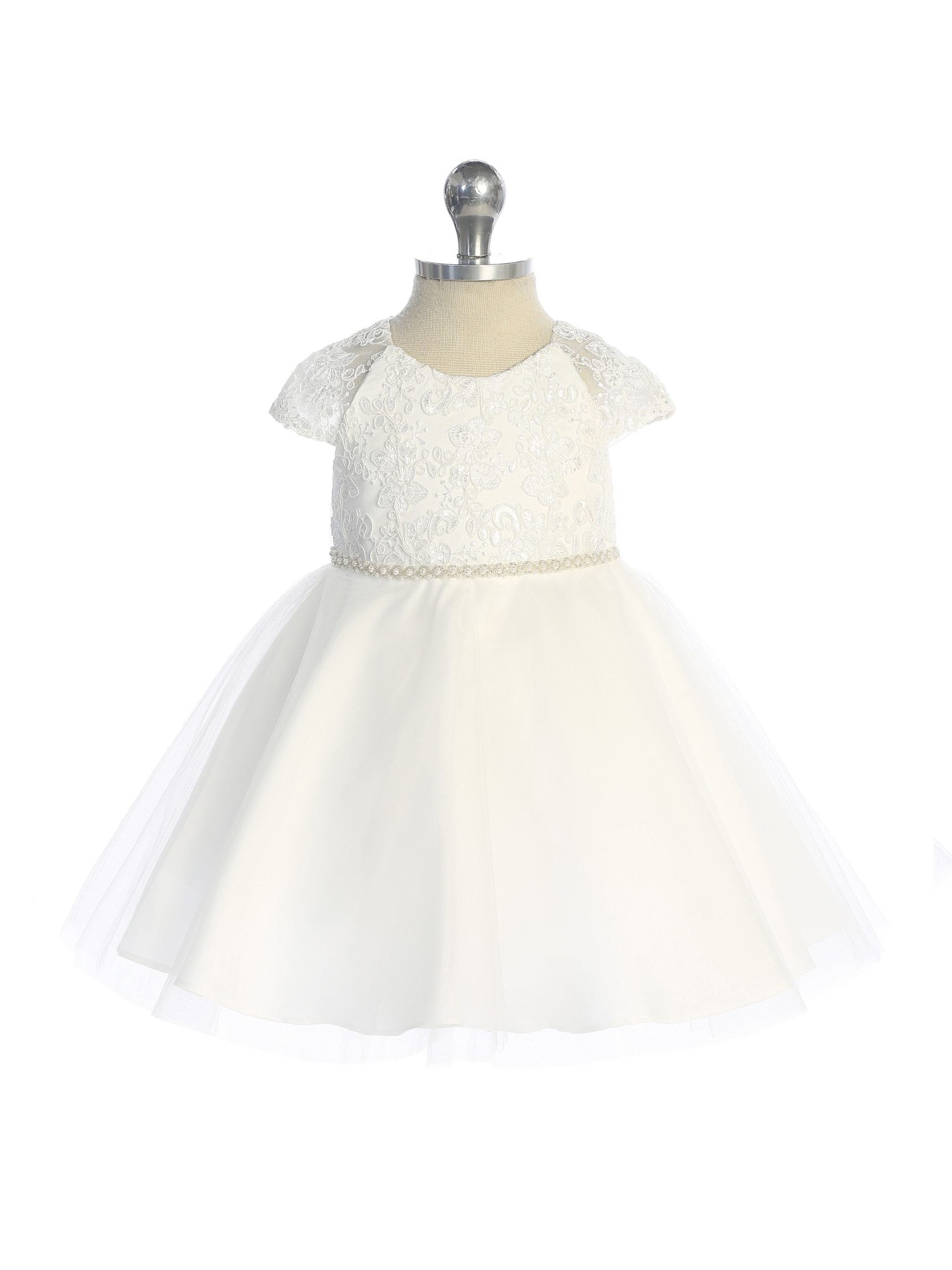 This dress is a captivating and elegant creation, designed to make your young flower girl feel like a fairy-tale princess on your special day. This enchanting dress features graceful cap sleeves. These sleeves provide comfort and ease of movement while maintaining a classic and elegant look. The dress boasts a corded lace bodice that exudes romance and refinement. As the dress flows down, it features scattered lace applique along the skirt. These delicate lace details create a captivating and harmonious transition from the bodice to the skirt. The dress is adorned with a beautiful beaded sash that cinches the waist with opulence and luxury. It is a dress that will make your flower girl feel like a graceful and radiant presence on your special day.