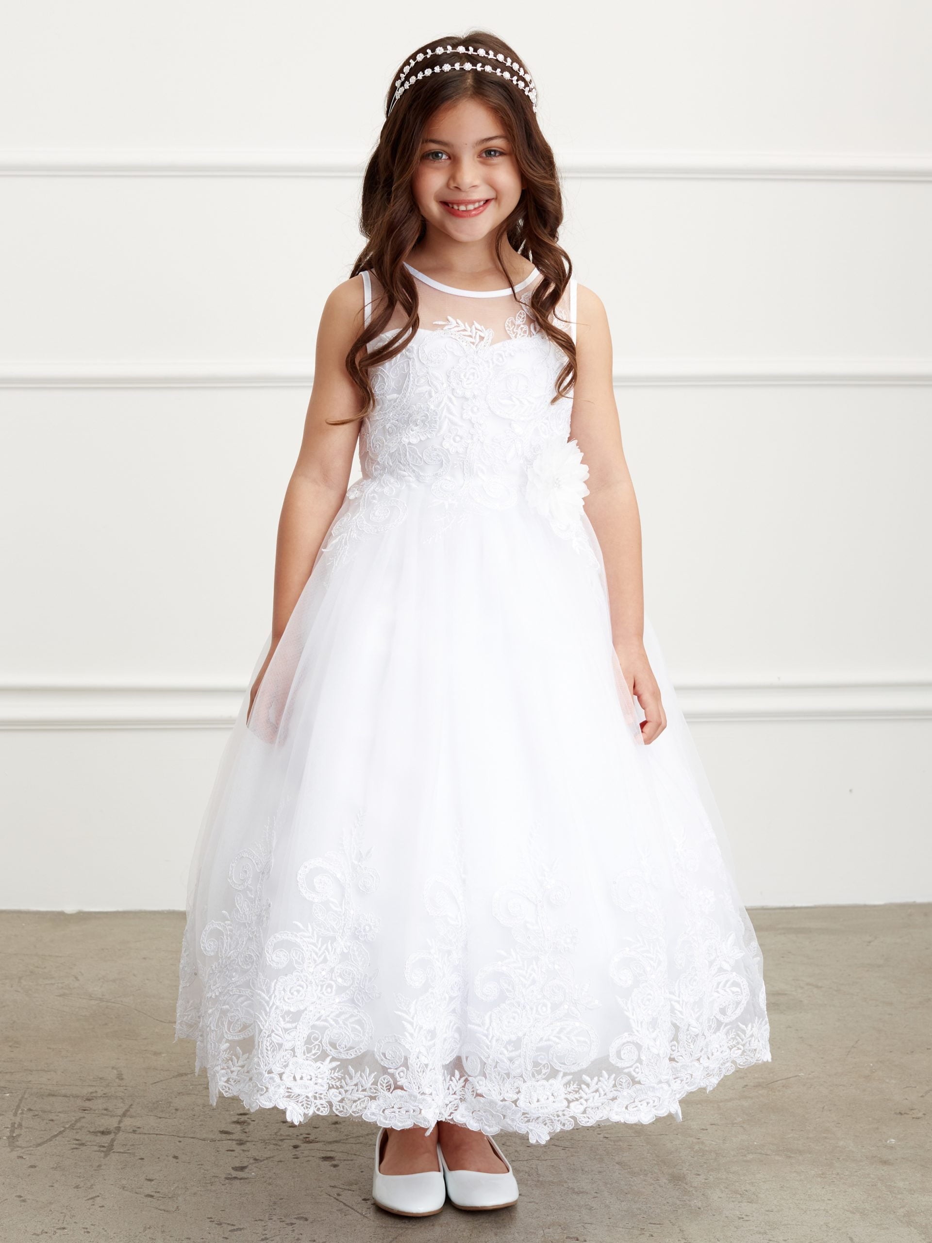 The dress begins with a delicate illusion neckline and intricate lacework graces the bodice, cascading down to the waist with a mesmerizing and intricate pattern. The corded lace not only adds a sense of timeless beauty but also imparts a subtle texture and dimension to the bodice. The hem of the dress has the same corded lace applique. At the waist, a removable flower accent adds a touch of whimsy and charm.