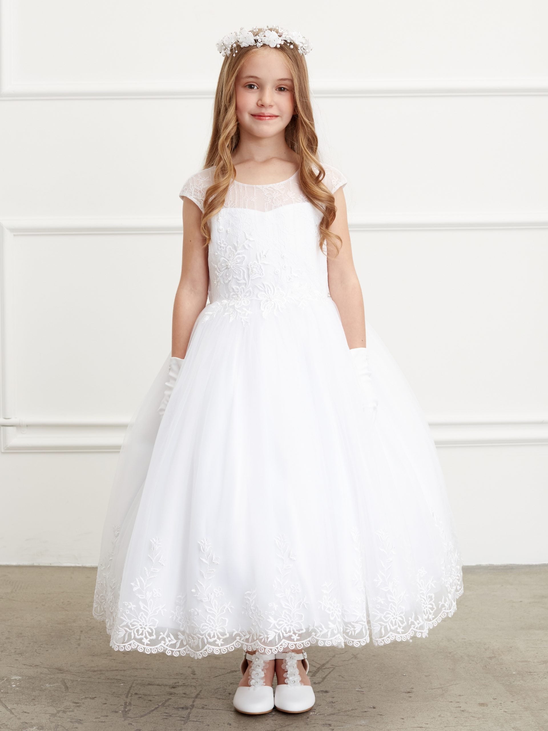 This dress is the perfect choice for celebrating this sacred moment in her life with elegance and reverence. This ethereal dress begins with an illusion neckline that adds a touch of purity and innocence to the design. The lace bodice, adorned with intricate floral lace applique, creates a sense of timeless beauty. The back of the dress features a large bow accent, adding a touch of youthful charm and celebration.