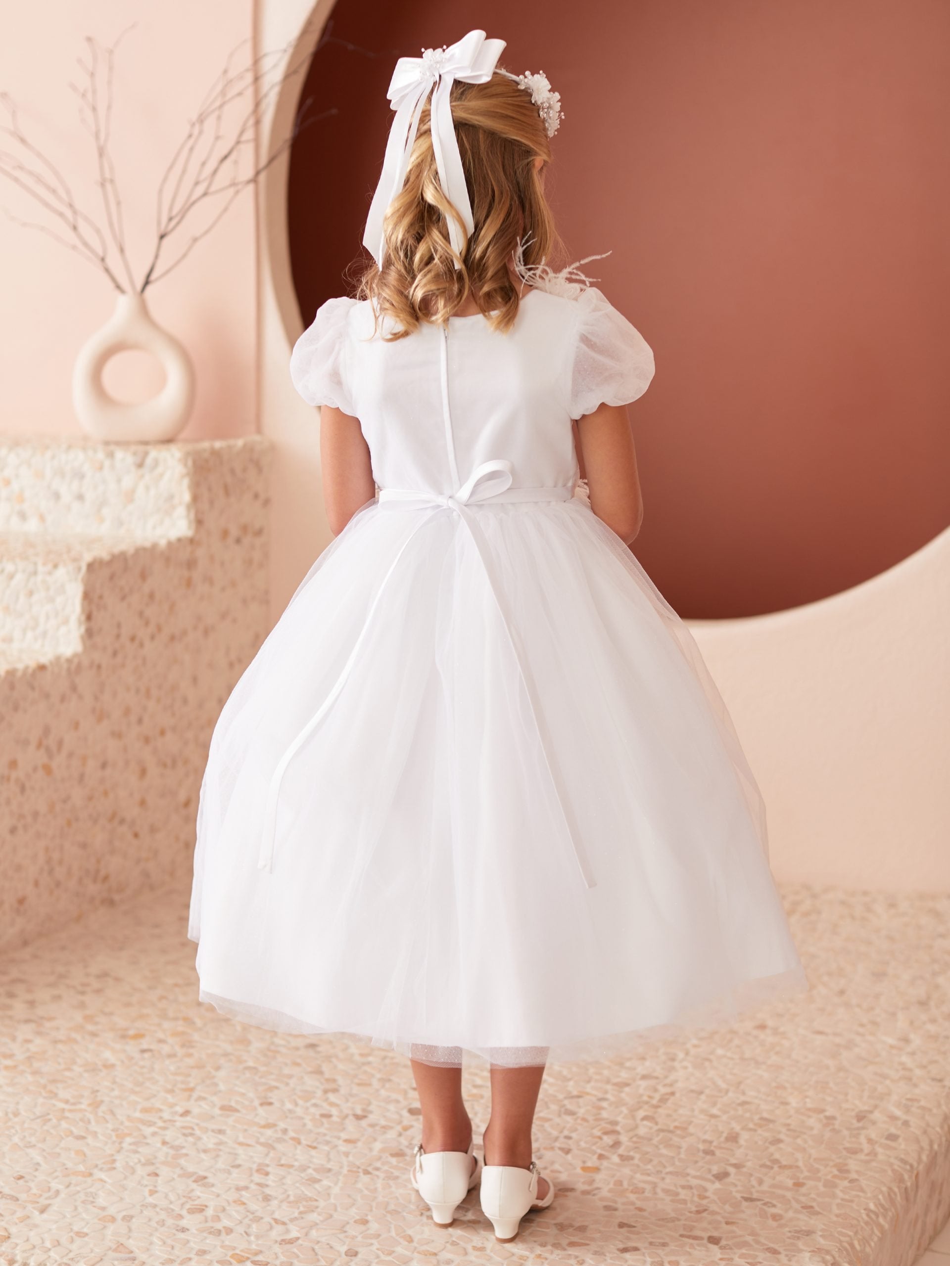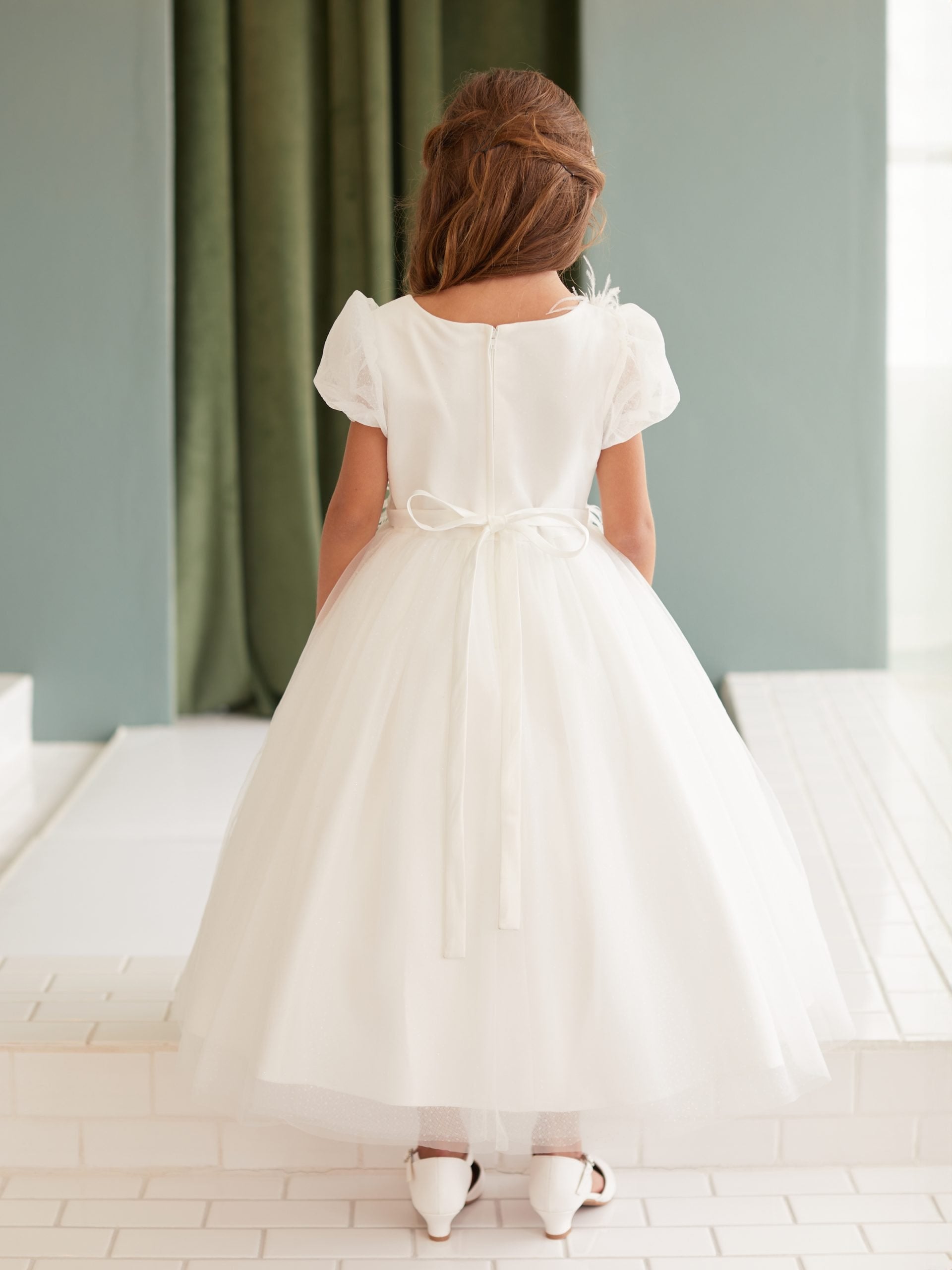 Formal kids dresses – This adorable tulle puff sleeve dress features gorgeous 3D flowers and beautiful feathers on the waist. Zipper back and sash tie back. Length – Tea Length (NOTE dress may fall at different lengths based upon each child’s body proportions).