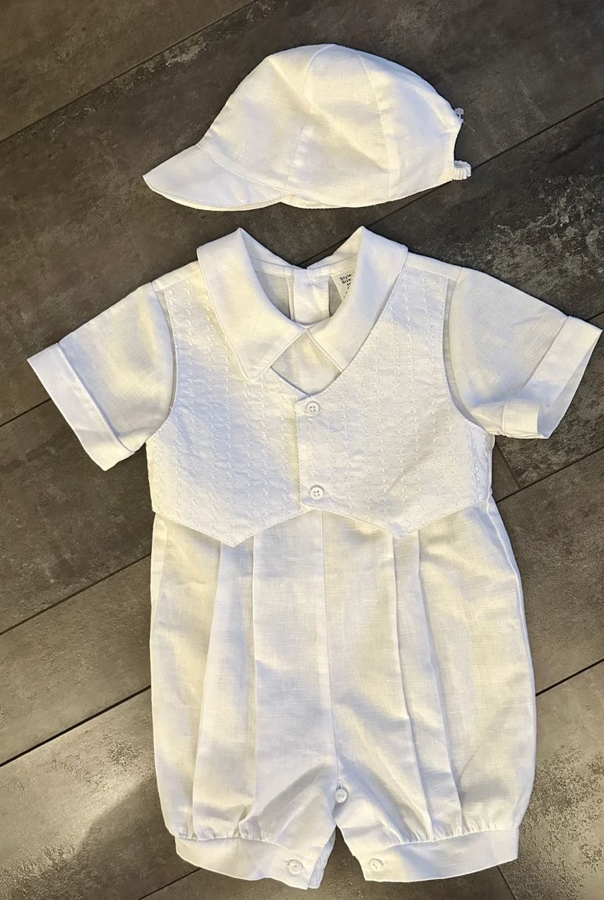 Linen romper with vest and cap!!! It's one piece , comfortable and soft!! Match it with our white leather shoes!