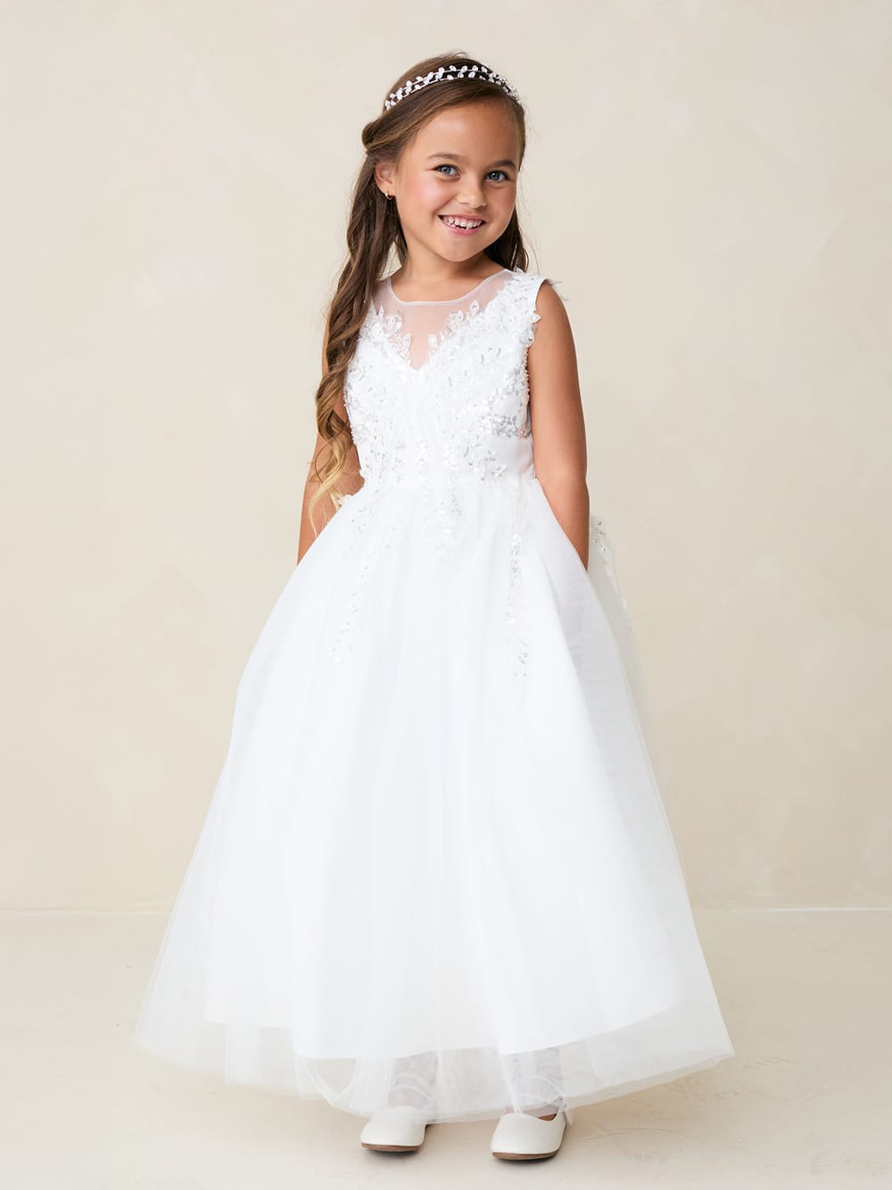 Formal kids dresses – This enchanting girls’ dress is a vision of elegance, perfect for special occasions. Featuring a delicate V-neckline with an illusion mesh panel, the bodice is adorned with intricate 3D floral appliqués and shimmering beadwork for a touch of sparkle. The voluminous mesh skirt flows gracefully, creating a dreamy silhouette fit for a princess. Finished with a comfortable fit and a secure back closure, this dress is ideal for flower girls, first communions, or any formal event where your little one deserves to shine.