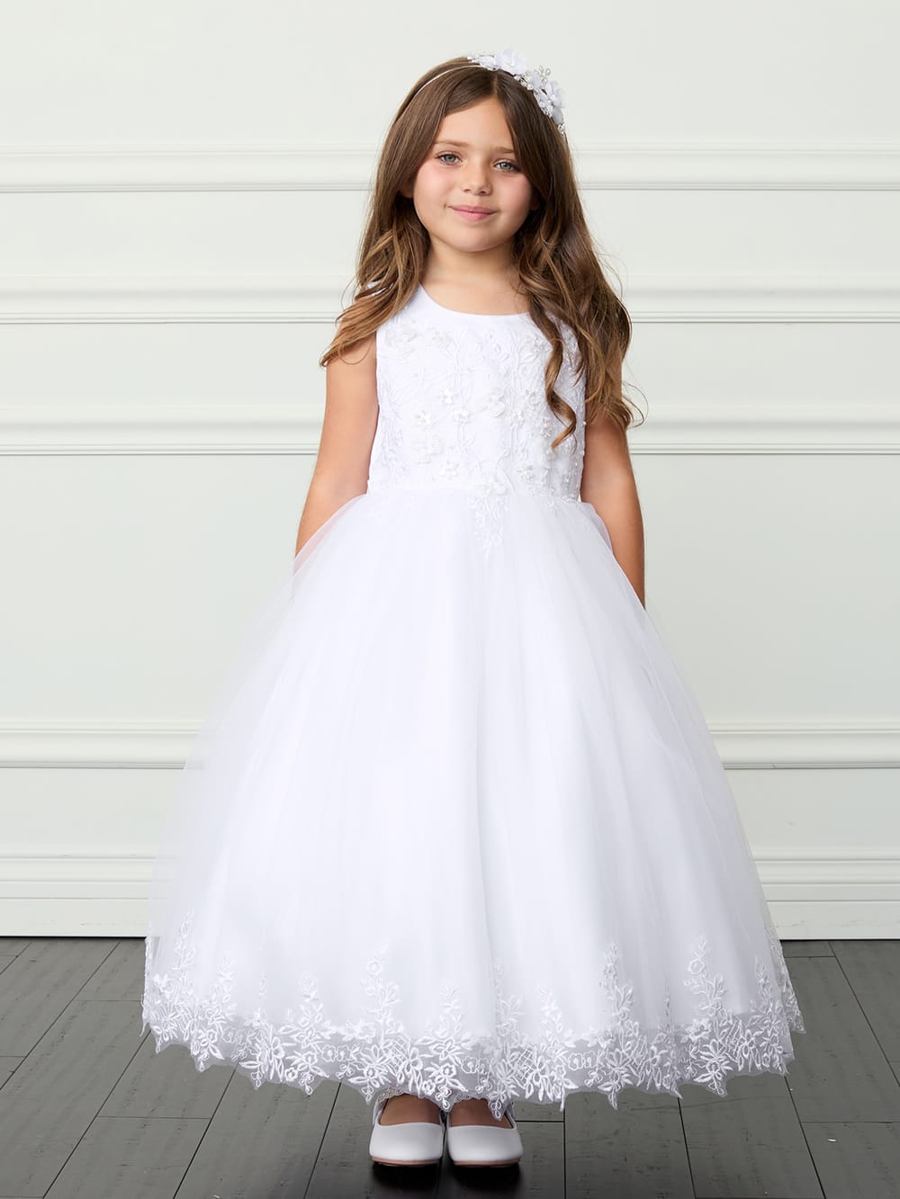Formal kids dresses – Grace meets charm in this stunning dress, featuring a lace bodice adorned with sequins and pearls. The flowing mesh skirt is beautifully finished with a delicate lace applique hem, adding a touch of elegance. Designed for comfort and style, it’s fully lined and secured with a rear center zipper and sash tie-back for the perfect fit. A timeless choice for any special occasion! Length – Ankle Length (NOTE dress may fall at different lengths based upon each child’s body proportions).